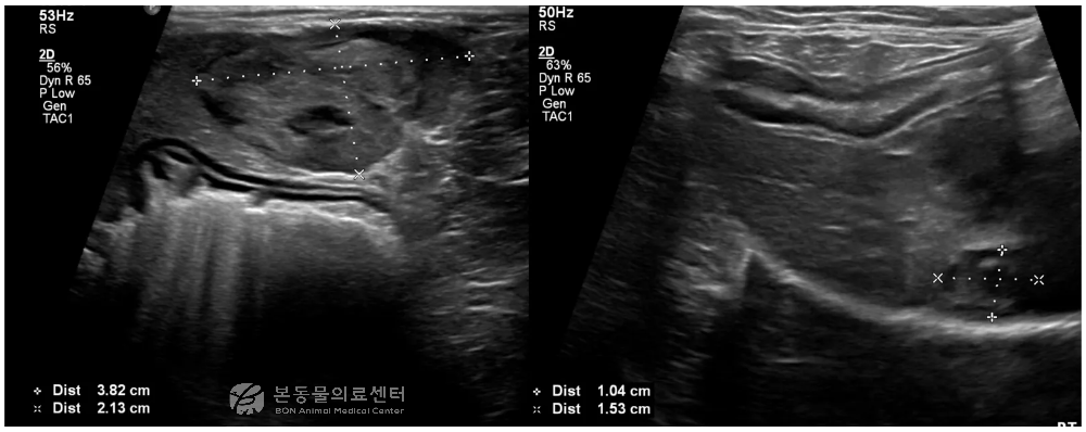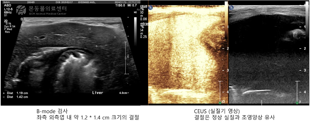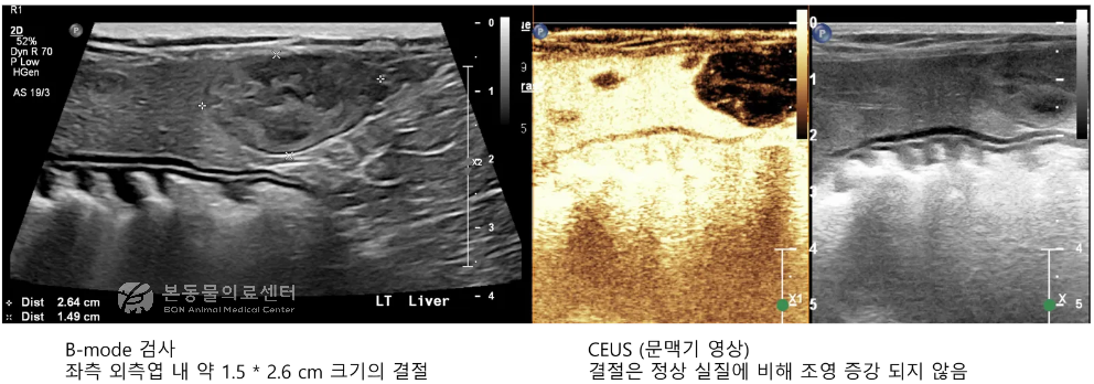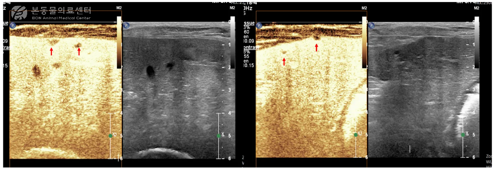 본동물의료센터에서는 기본 초음파 검사에서 간 결절이 확인된 경우, 간 조영 초음파 검사(CEUS)를 함께 시행하여 진단의 정확도를 높이고 있습니다.