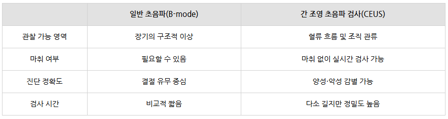 간 조영 초음파 검사는 마취 없이 실시간으로 혈류 변화를 확인할 수 있고, 방사선 노출이 없으며 신체에 부담이 적다는 점이 큰 장점입니다.