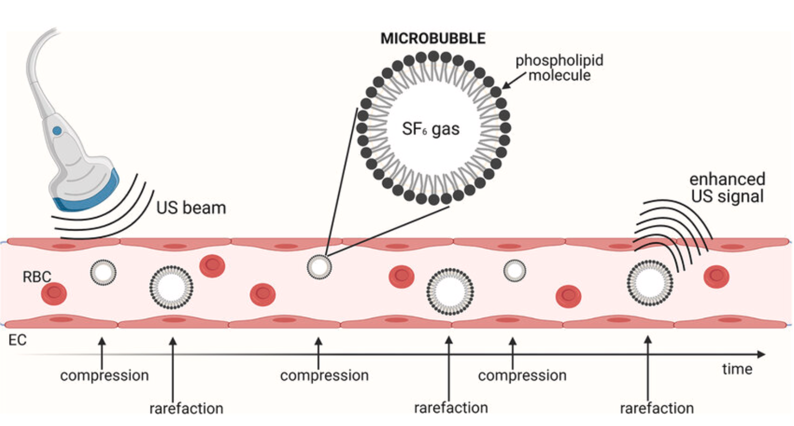 검사 시 신체에 무해한 미세 기포(조영제)를 정맥으로 주입하면, 이 기포가 초음파와 반응하여 영상에서 반짝이는 신호로 나타나게 됩니다.