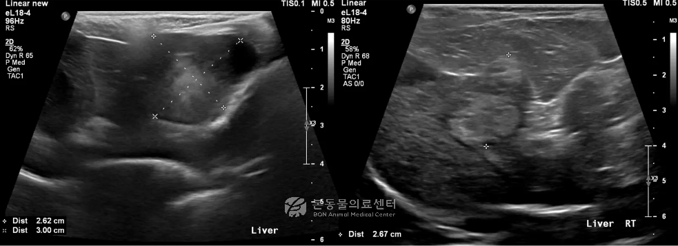 아래 이미지는 각각 중성화 암컷 7살령 말티즈 강아지와 중성화 수컷 9살령 포메라니안 강아지의 초음파 검사 결과입니다.