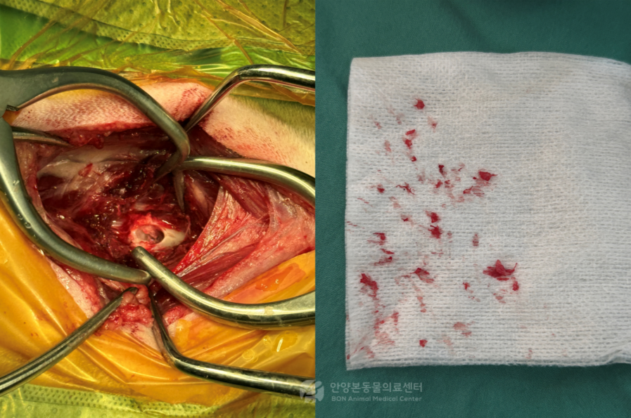 [배쪽 창냄술(좌) 수술로 제거된 디스크 물질(우)]
