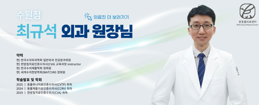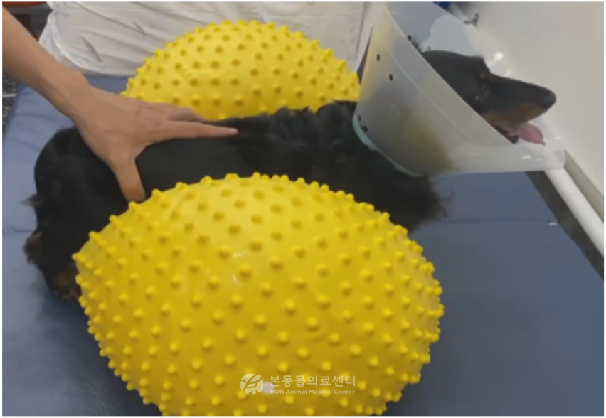 본동물의료센터에는 침치료 인증 수의사(CVA), 재활 물리치료 자격(CCRV, CCRT), 동물 추나·마사지 자격(CVTP)을 갖춘 의료진이 있어서 디스크 수술 이후 환자의 신경 손상 정도와 기능 회복 단계에 맞는 재활 물리치료를 계획하고 시행할 수 있습니다.