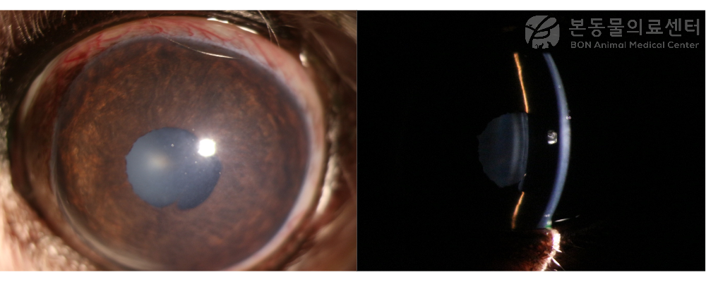 기본 시력 검사(동공/ 눈부심/ 위협 반응)은 모두 정상적이었으나, 왼쪽 눈의 안압이 상승되어 있었고 (31 mmHg) 생체 현미경 검사 (Slit-lamp biomicroscopy) 시 왼쪽 눈의 뚜렷한 이상은 확인되지 않아, 홍채 유착/ 안내 염증/ 안내 종괴 등은 배제 되었습니다.