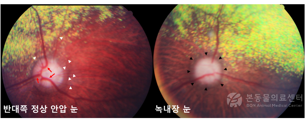 ** 정상 안압인 눈에서 관찰되는 정상적인 망막 혈관(하얀색 화살표 머리)과 시신경 유두내의 혈관(붉은색 화살표)들은 녹내장 눈에서는 확인되지 않습니다. 녹내장 눈에서의 시신경 유두 (검은색 화살표 머리)는 정상과 비교해서 둥근 형태로 변화되어 있습니다.