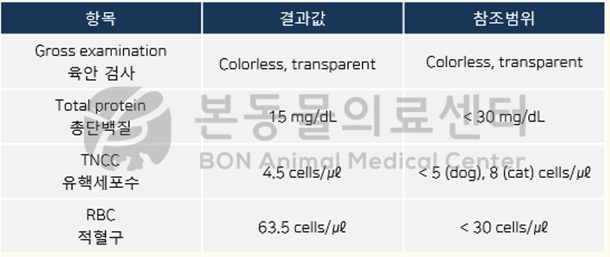 MR 검사 상 좌측 소뇌 반구에서 비교적 경계가 뚜렷한 병변이 확인되었으며, 각 MR 영상 결과를 종합한 결과 허혈성 소뇌 경색이 가장 의심되었습니다. CSF 검사 상에서는 특이 소견은 확인되지 않았습니다.