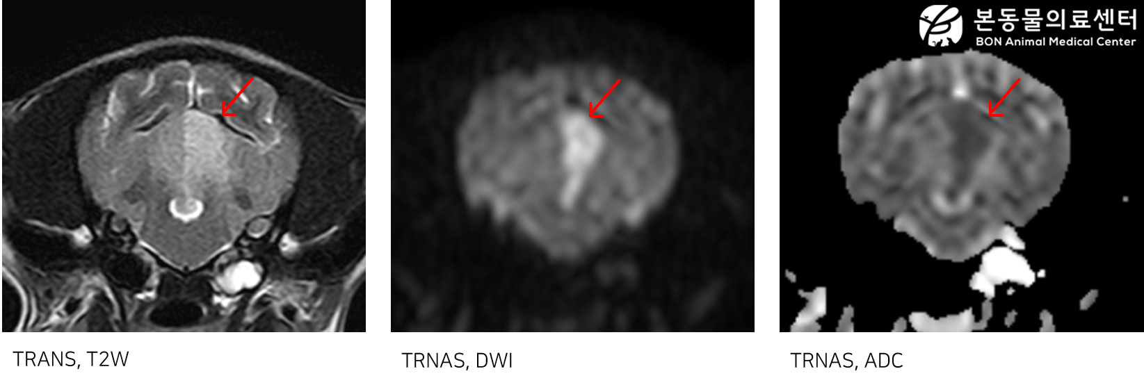 병력으로는 3일전 부터 식욕 및 활력 저하가 나타나 빈혈, 신장수치 상승, 췌장염으로 입원 중이었으며, 갑자기 신경증상이 발생하여 MRI를 촬영하였습니다.