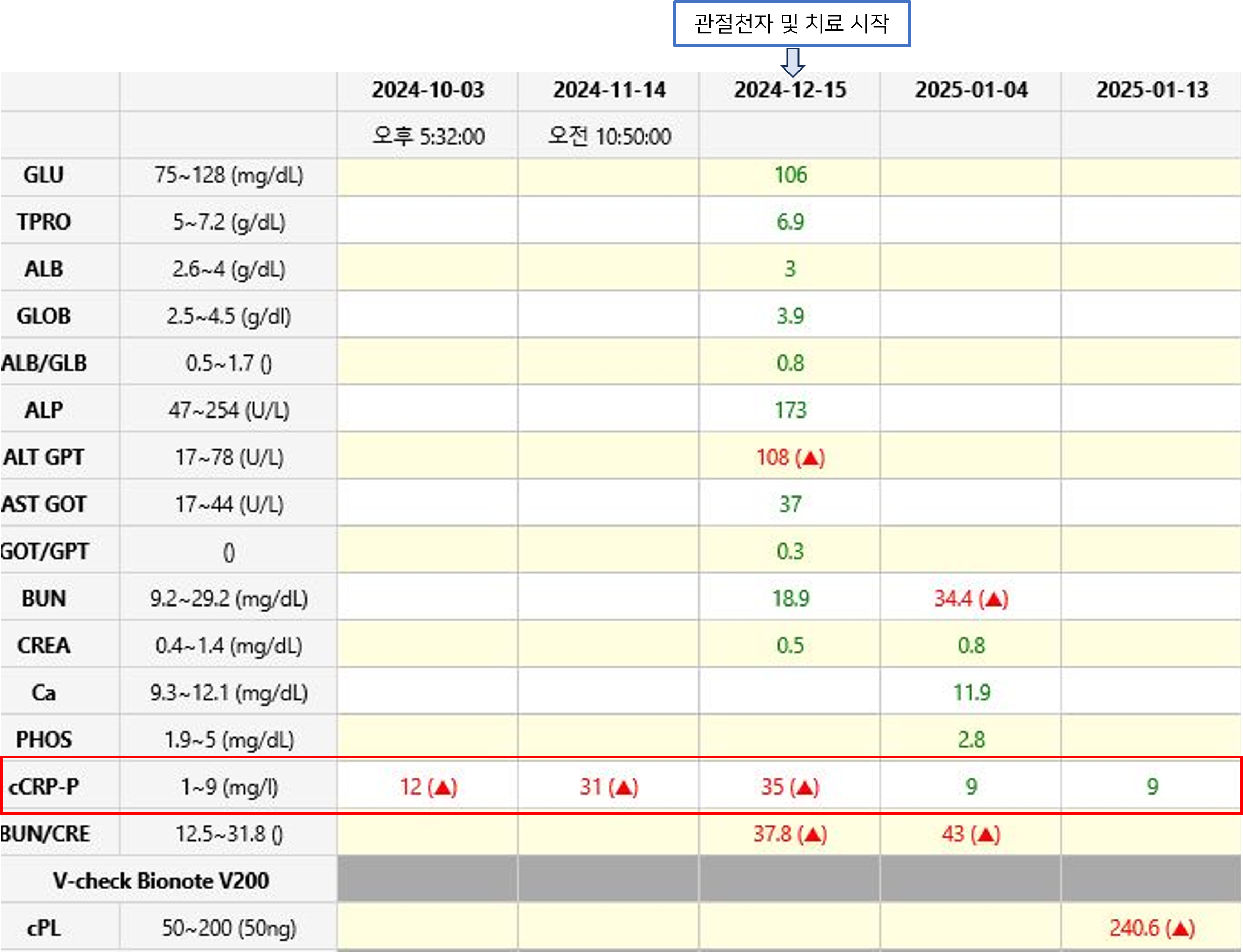 기본적인 혈액 검사 상 염증수치(CRP) 상승 외에는 혈액검사 상에서 특이사항은 확인되지 않아, 지속적인 염증 수치 상승 시 추가 검사를 실시하기로 하였고, 2개월 뒤 재검 시에도 뚜렷한 염증 수치 상승이 지속되어 관절낭 천자를 실시하였다.