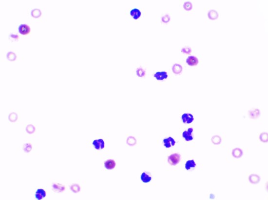 관절 천자는 우측 뒷다리 무릎관절과 좌측 뒷다리 발목 관절에서 진행하였으며 검사 결과 관절액의 점성 저하와 현미경 상 감염체는 확인되지 않으나, 백혈구의 한 종류인 호중구가 90%이상 차지하는 화농성 관절염이 진단되었다.