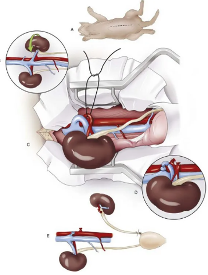 강아지는 좌우 두 개의 신장을 가지고 있기 때문에 신장 종양, 지속적인 출혈, 심한 염증, 수신증, 요관 손상 등이 있을 경우 반대쪽 신장이 정상이라면 한쪽 신장을 제거하는 수술이 가능합니다. 신장 종양의 경우에는 종양이 있는 한쪽 신장을 완전히 제거하는 신장절제술이 일반적인 치료 방법입니다.