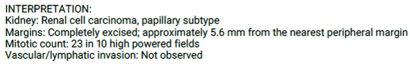 수술 중 복강경을 통해 종양으로 변화된 우측 신장을 확인하였고, 요관을 결찰한 뒤 안정적으로 우측 신장을 제거하였습니다. 절제된 신장 종괴는 최종 조직검사 결과 신세포암(Renal Cell Carcinoma)으로 진단되었습니다.