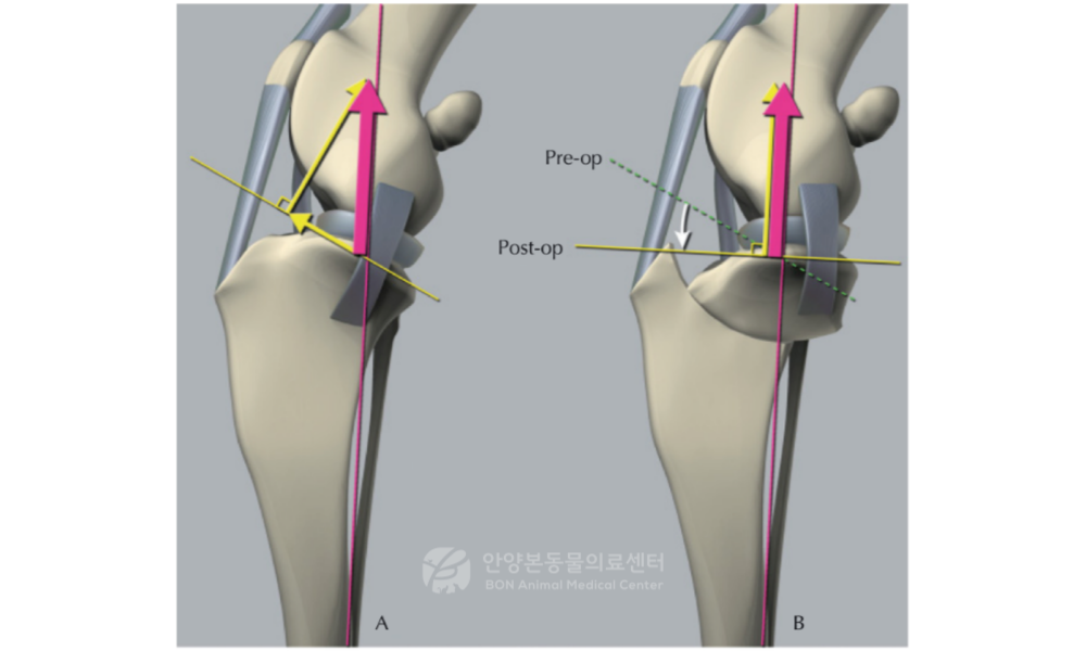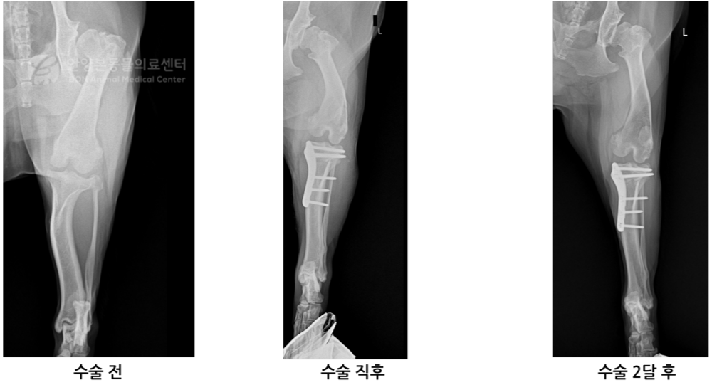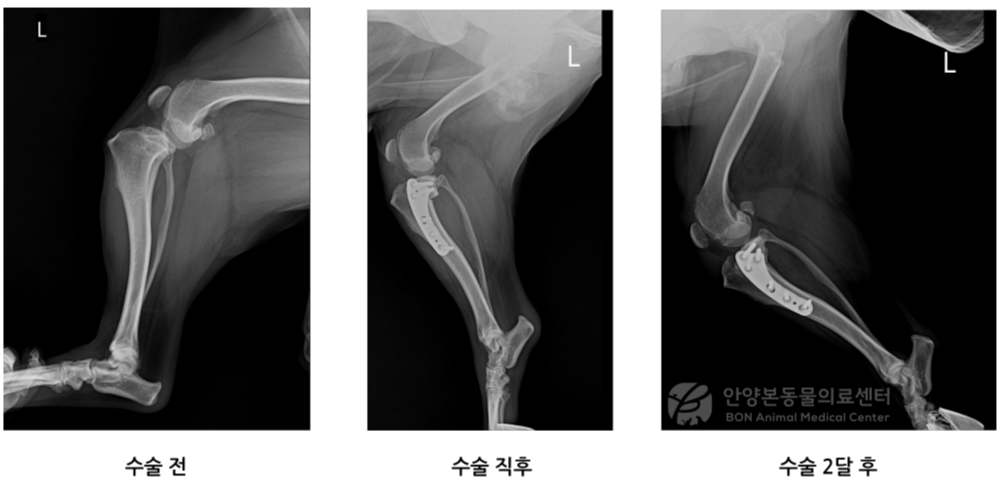 본 환자는 몸무게 및 퇴행성 관절염 정도를 고려하여 경사면 평탄화 경골 절골술 (TPLO) 를 실시했습니다. 이 수술은 경사면을 절골 후 평탄하게 재배치하여 무릎 관절의 안정성을 확보하는 목적으로 실시했습니다.