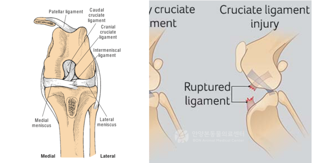 이로 인해 다리에 체중을 제대로 싣지 못해 다리를 들고 다니거나 절뚝거리며 걷는 등 파행 증상을 보이게 됩니다. 전십자인대 단열로 인해 무릎 관절의 불안정성이 생기면 관절 연골이 손상되며, 이는 관절염 및 통증을 유발하게 됩니다.