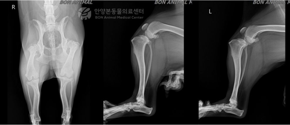 진통제 투여에도 증상 호전은 없었고, 발을 땅에 딛지 못하는 좌측 후지 파행 상태로 확인되며 신체 검사 상 전십자인대 손상이 의심되어 추가적으로 후지 방사선을 촬영했습니다.