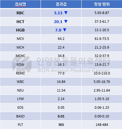혈액 검사 상 심한 빈혈, 고빌루빈 혈증, 염증 수치 상승이 확인되었고, 추후 수혈이 필요한 상황에 대비하여 혈액형 검사도 진행하였다.