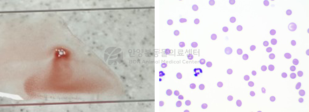 육안 상 혈액 응집 확인, 혈액 도말에서 구상적혈구의 증가, 적혈구 표면의 항체 또는 보체를 검출하는 직접 항체 검사는 음성으로 확인되었다.