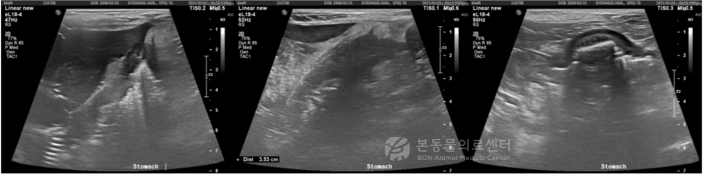 초음파 검사 결과: 복강 내 가스 음영(위장관 천공 의심) 및 이쑤시개로 의심되는 위벽을 뚫은 이물(약 3.5cm) , 위 내강 1.5cm 크기 이물이 확인되었습니다.