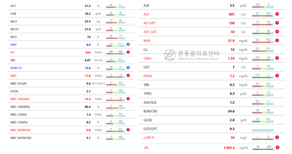 본동물의료센터에서는 아이의 내원 즉시 혈액 검사와 영상 검사를 진행했습니다. 검사 결과는 아래와 같았습니다.