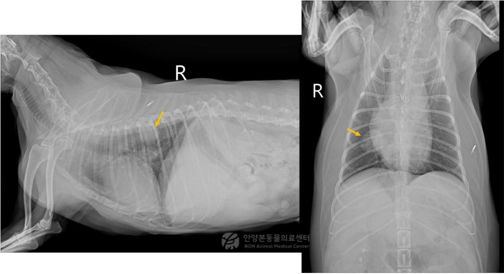 이번 환자는 15년령 중성화 수컷 푸들로, 평소 물을 빨리 마실 때 가끔 켁켁거리며 구토하는 증상 외에는 특별한 이상 소견이 없던 아이였습니다. 정기 건강검진 과정에서 시행한 흉부 방사선 검사에서 폐종괴가 의심되어 안양본동물의료센터에 내원했습니다.