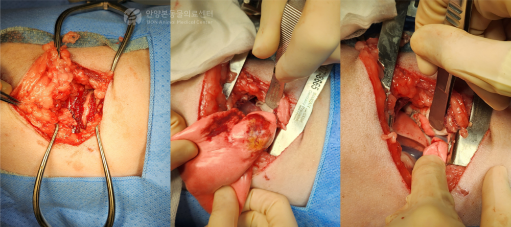 수술 시 개흉을 통해 우측 후엽에 단독으로 위치한 종괴를 확인할 수 있었으며 주변 조직과의 유착 소견은 관찰되지 않았습니다. 이에 따라 우측 후엽 전체를 절제하는 폐엽절제술을 시행하였습니다.