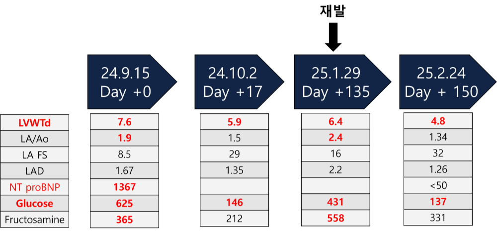 현재는 이뇨제 및 인슐린 중단, 혈당강하제(SGLT2 inhibitor)로 관리 중이며, 15개월이 지난 현재까지 안정적인 식욕, 활력, 호흡수를 유지하고 있습니다. 또한 정기적으로 2~4주 간격 혈액검사 및 흉부 방사선, 3개월마다 심장 초음파 및 심전도 검사를 통해 추적 관찰을 진행하고 있습니다.