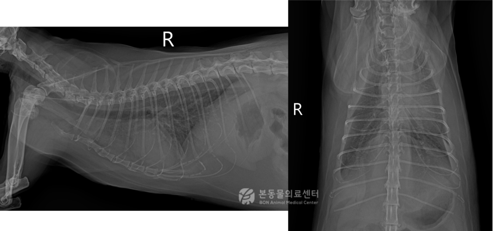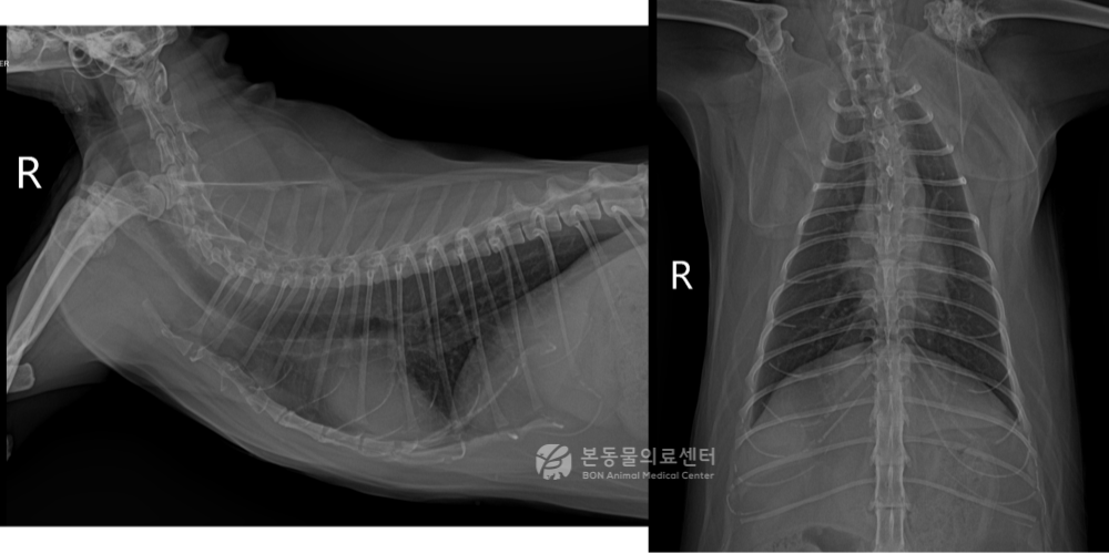 11살령 코리안숏헤어, 중성화된 수컷 고양이가 호흡곤란, 다음·다뇨, 식욕부진, 기력 저하를 주증으로 본동물의료센터에 내원하였습니다. 병력상 2개월 전 당뇨 진단을 받은 상태였으며, 내원 당일에는 입을 벌리고 숨을 쉬는 개구 호흡과 뚜렷한 호흡곤란이 관찰되었습니다.