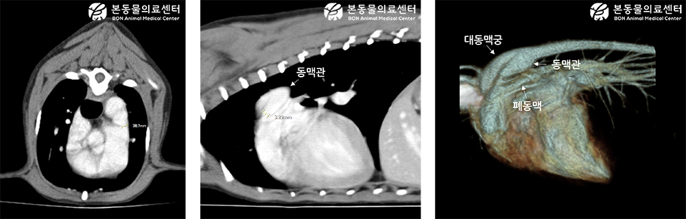 본동물의료센터에서는 동맥관개존증의 정확한 평가를 위해 일반적인 심장초음파 검사 뿐만 아니라, 필요에 따라 경식도심장초음파, 심장전산화단층촬영(Cardiac CT), 심장자기공명영상(Cardiac MRI)를 진행하고 있으며, 다양한 상태에 따른 치료법들 (개흉을 통한 수술적 동맥관 결찰, 심혈관 중재적 시술)을 적용해 좋은 치료 예후를 보이고 있다.