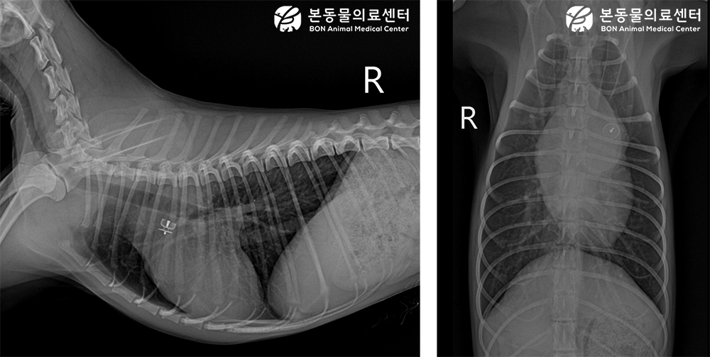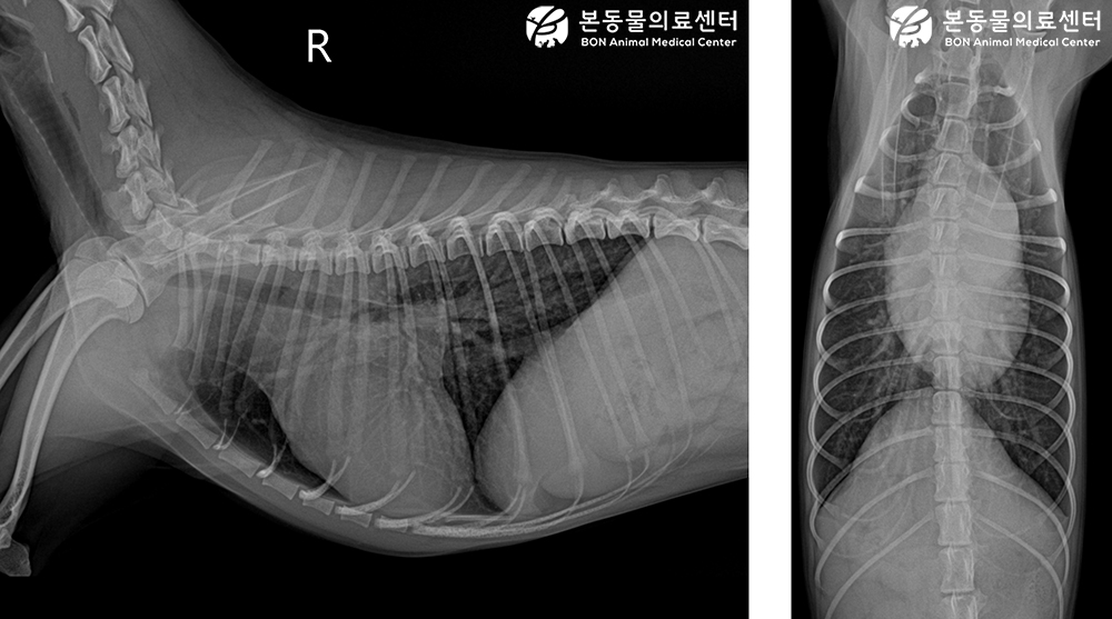 심장과 관련된 임상 증상 (호흡이상, 운동 불내증, 청색증, 실신 등)은 보이지 않았고 정밀 평가를 위해 흉부 방사선 및 심장 초음파 검사를 실시하였다.