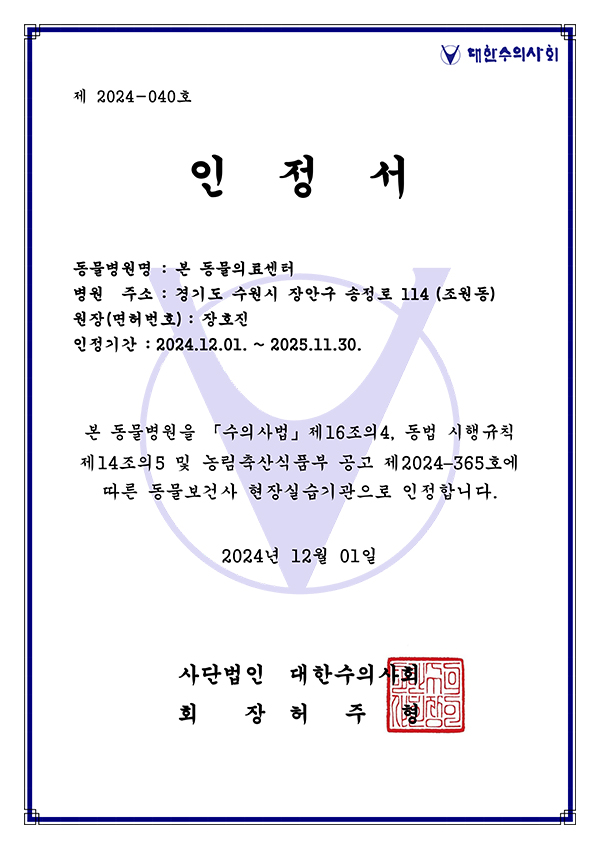 본동물의료센터(수원점, 안양점)가 동물보건사 현장실습기관으로 인정받았습니다.