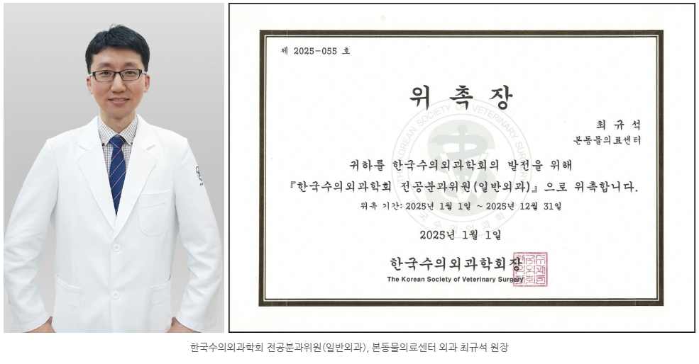 또한, 본동물의료센터 외과 김영범 원장님, 최규석 원장님은 전공분과위원(일반외과)으로서