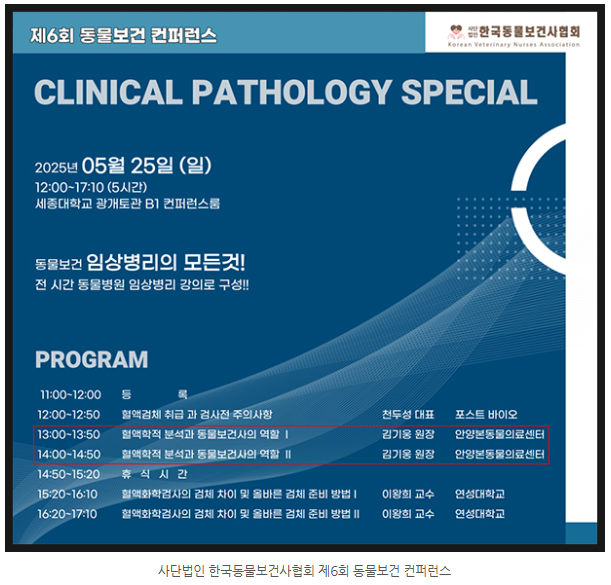 안양본동물의료센터 김기웅 원장님은 이번 동물보건 컨퍼런스에 강사로 초청되어 '혈액학적 분석과 동물보건사의 역할'에 대해 강의하였습니다.