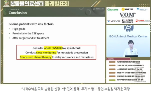 침습적 특성을 가진 신경교종의 전이 양상과 전체 중추신경계 MRI의 필요성, 재발 억제를 위한 동시 항암 화학방사선 요법 등을 설명했습니다.