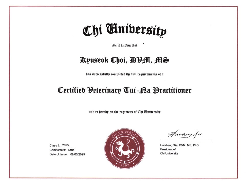 동물추나마사지치료인증수의사(CVTP, Certified Veterinary Tui-na Practitioner) 자격증본동물의료센터 외과 최규석 원장님이 미국 플로리다주의 CHI UNIVERSITY에서 진행한
