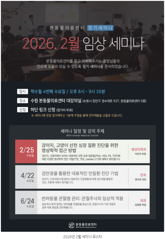 본동물의료센터는 임상 수의학의 발전과 의료진의 전문성 강화를 위해 매 짝수 달 네 번째 주 수요일, 정기 세미나를 개최하고 있습니다.